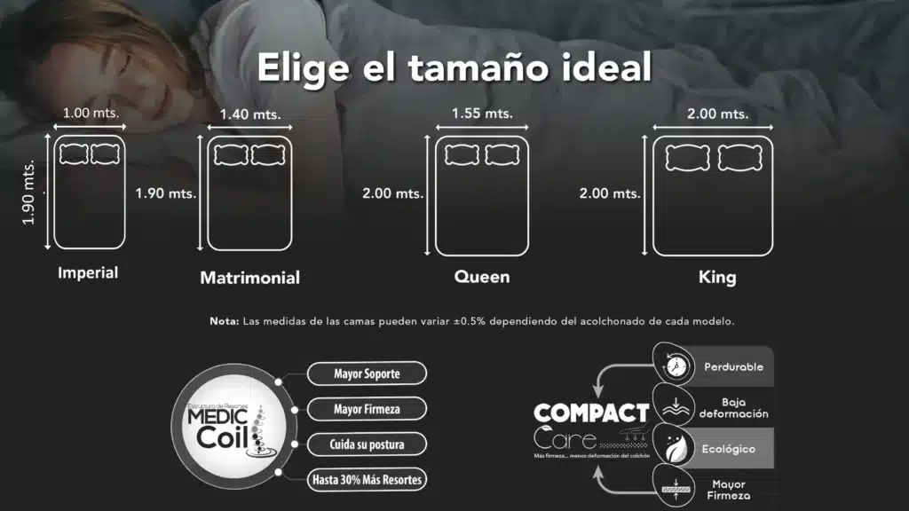 Tamaños disponibles: Imperial 1.00 x 1.90mts., Matrimonial 1.40 x 1.90 mts., Queen 1.55 x 2.00 mts., King 2.00 x 2.00 mts. |