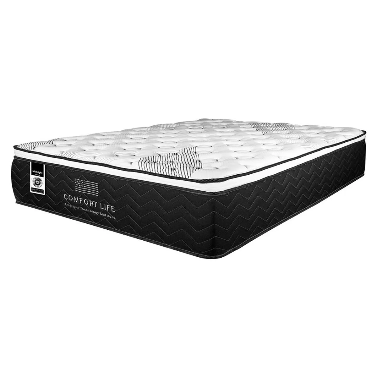 | Descripción breve | El colchón Midnight de Comfort Life combina un pillow top de confort firme con bordes reforzados para mayor estabilidad. Su diseño reversible prolonga su vida útil, mientras que su base acolchonada brinda soporte solido. Disponible en tamaños Imperial, Matrimonial, Queen y King. Garantía de 12 años para tu tranquilidad. |