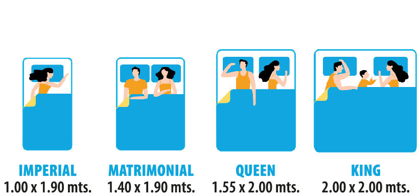 Tamaños disponibles: Imperial 1.00 x 1.90 mts., Matrimonial 1.40 x 1.90 mts., Queen 155 x 2.00 mts., King 2.00 x 2.00 mts. |