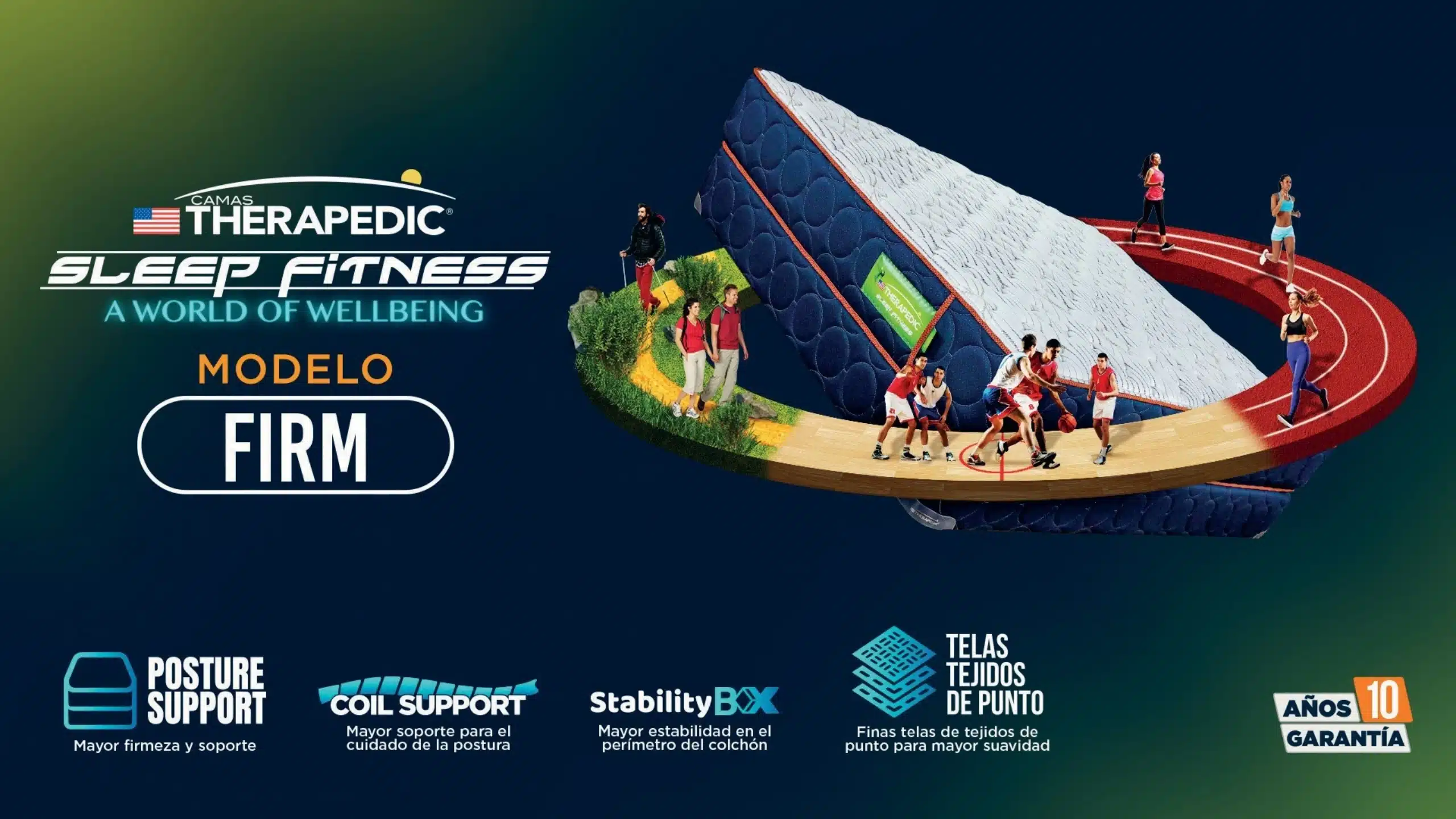 La cama Sleep Fitness Firm de Therapedic esta diseñado para proporcionar firmeza y soporte superior. Su tecnologia Posture Support garantiza mayor estabilidad y cuidado de la espalda, mientras que el sistema Coil Support asegura una alineacion optima de la columna, asegurando un descanso saludable y una postura correcta durante toda la noche. El Stability Box refuerza el perimetro de la cama, garantizando mayor durabilidad y estabilidad; evitando deformaciones. Ademas, sus finas telas de tejidos de punto brindan suavidad y confort en cada uso.