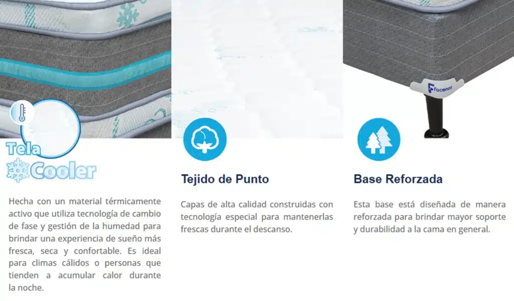 | Tipo de producto | Cama y colchón Tamaños disponibles: Matrimonial 1.40 x 1.90 mts., Queen 1.55 x 2.00 mts., King 2.00 x 2.00 mts. |