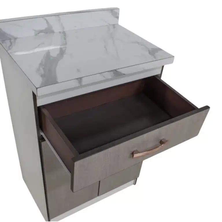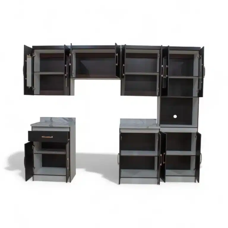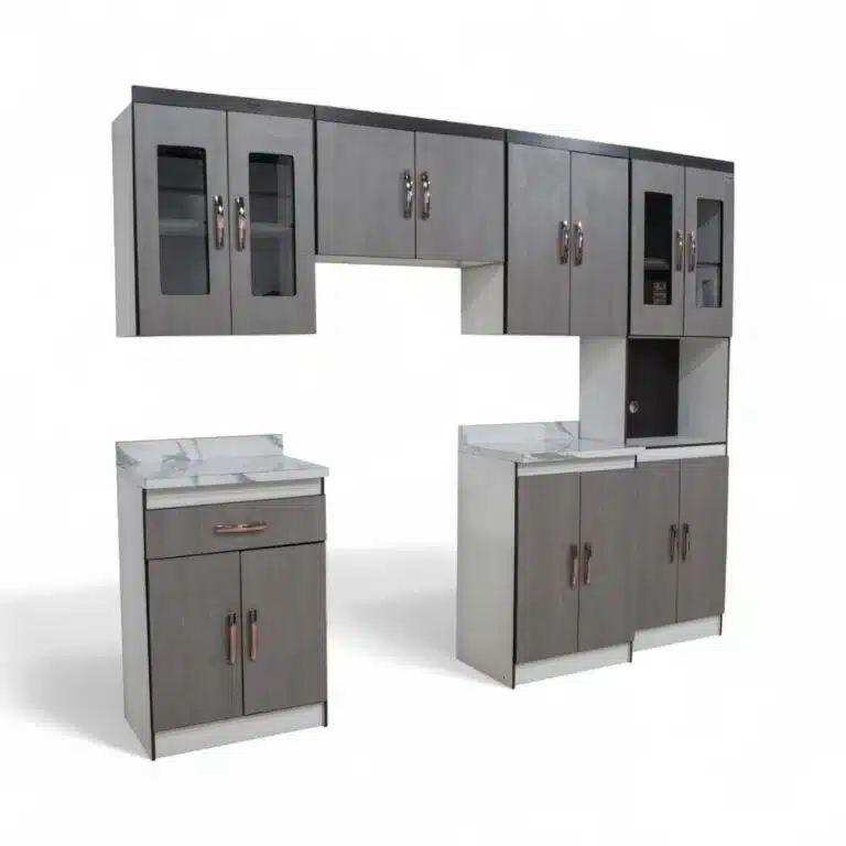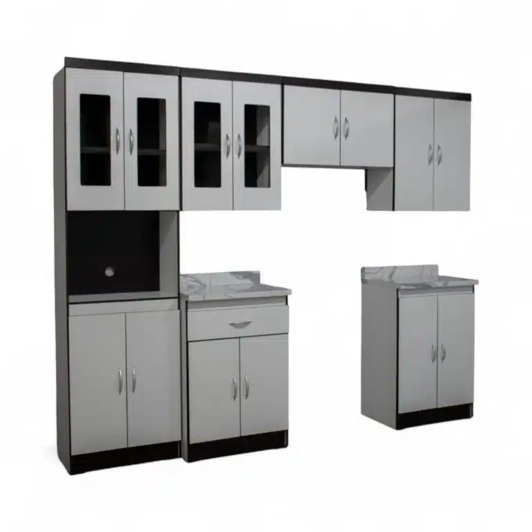 Cocina OVIEDO es una opción funcional y estilizada que incluye despensa vertical con puertas de vidrio, base con gavetas, y módulo aéreo superior también con detalles en vidrio. Esta cocina se adapta a diferentes espacios.