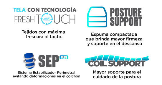 | Descripción breve | El Therapedic Active Firme ofrece descanso con tecnologia avanzada. Tela con tecnología Fresch Touch con máxima frescura al tacto. El Coil Support cuida la postura y el Stability Box refuerza la estructura. Ideal para un sueño reparador y saludable. |