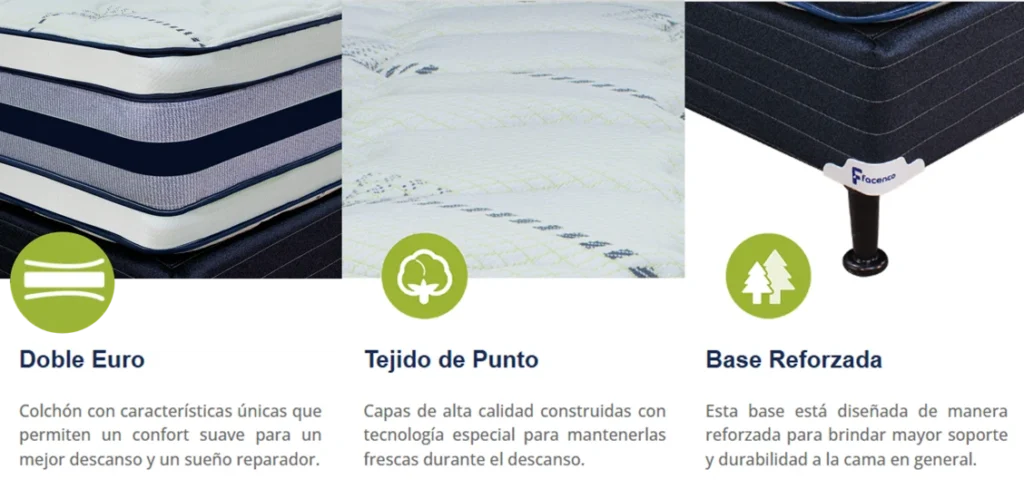 | Descripción breve | Un Colchón que cuenta con Doble Euro Pillow de 3″ de acolchonado en ambos lados, con tela Piqué para mayor frescura,cuenta con más resortes para mayor firmeza y mejor soporte. La Base puede usarse como cama para emergencias. |